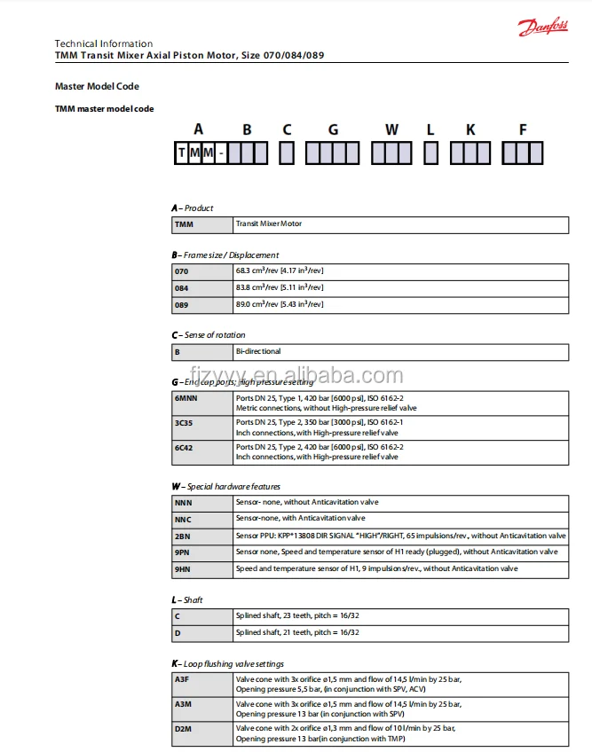 Product Overview: The Danfoss TMM series is a premier line of axial piston variable displacement pumps specifically engineered for Concrete Mixer Truck hydrostatic drives. Covering essential displacements including 70cc (TMM070), 84cc (TMM084), and 89cc (TMM089), this series features flagship models like TMM070B6C42NNNDA3MBDN and TMM089B6C42NNNNN0. Built for closed-circuit operation, the TMM series integrates charge pumps and multi-functional valves to handle the demanding constant rotation during transport and rapid reversal during discharge. Its rugged swashplate design ensures maximum uptime under heavy vibrations and the harsh conditions of construction sites.