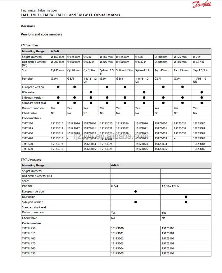 Product Overview: The Danfoss TMT Series sets the premium benchmark for performance in the orbital motor industry. This category encompasses the standard TMT, the compact TMTU, and the wheel-mount optimized TMTW. We feature the full displacement matrix: TMT-250/315/400/470/500/630, alongside precision specific models like the TMT470 FLV (Part No: 11009374 / N13731401). Utilizing advanced Disc Valve technology and reinforced bearing architectures, TMT motors deliver stable, massive torque even under extreme radial loads. They are the premier choice for large harvesters, heavy-duty material handling machinery, drilling rigs, and construction vehicle drives.