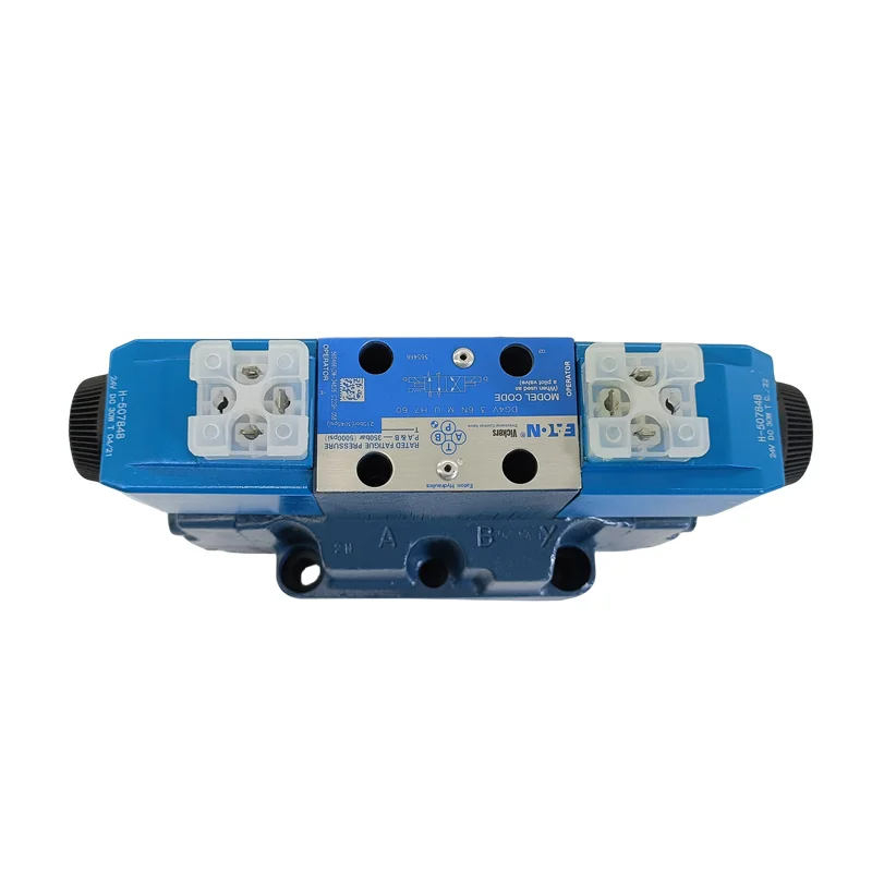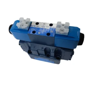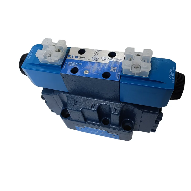 Product Overview: The Vickers DG4V series by Eaton features high-performance, two-stage hydraulic directional valves. The assembly consists of a small pilot solenoid valve (typically a DG4V-3) mounted on a high-flow main stage. These valves are specifically engineered for industrial applications requiring massive flow capacities and high-pressure switching. By using pilot pressure to actuate the main spool, the DG5V series controls substantial hydraulic power with minimal electrical input, making it indispensable for large forging presses, heavy machine tools, and large-scale power units.