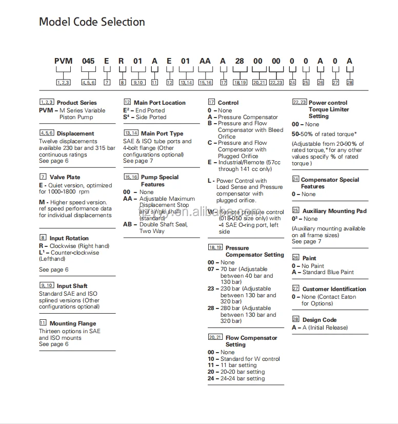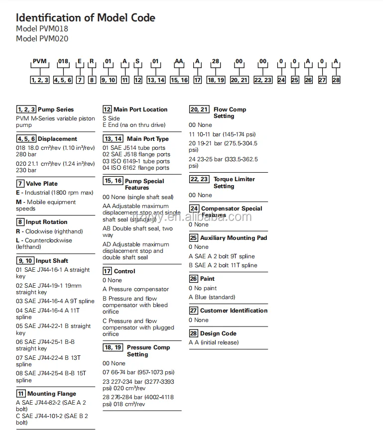 Product Overview: The Vickers PVM series stands as Eaton’s premier “quiet-running” variable piston pump solution specifically engineered for industrial environments. This selection covers the complete range from the ultra-compact 18cc (PVM018) to the high-capacity 141cc (PVM141). Featured models like the PVM018ER01BAS… lead the market in reliability. Utilizing patented valve plate damping technology and thick-walled housings, the PVM series drastically minimizes operational noise, making it the premier choice for CNC machine tools, plastic machinery, conveyor drives, and indoor hydraulic power units (HPUs). Its compact dimensions and versatile control options ensure precise flow and pressure regulation even in confined spaces.